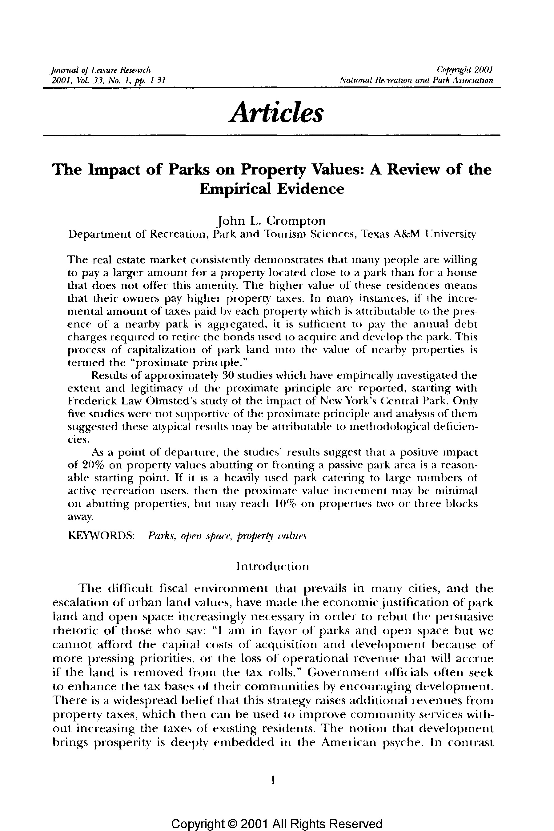 The Impact of Parks on Property Values: A Review of the Empirical Evidence