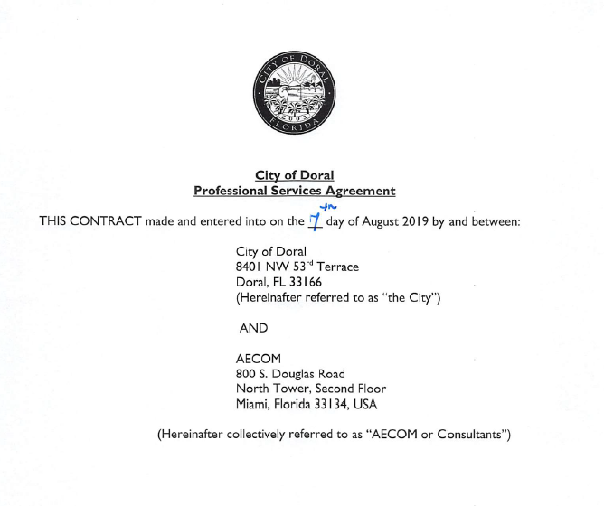 This contract made and entered into on the 7th day of August 2019 by and between the City of Doral and AECOM.