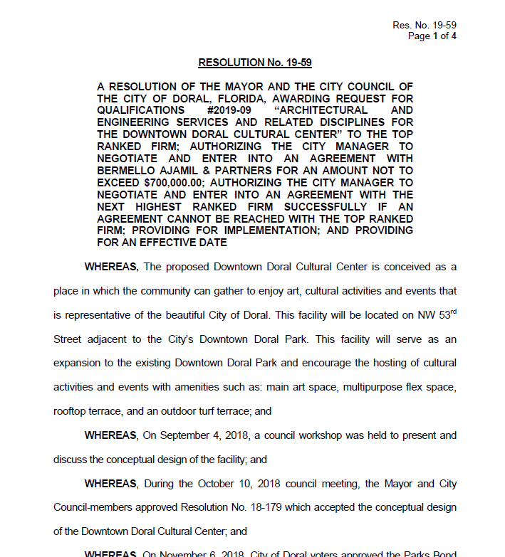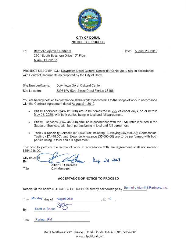 City of Doral Notice to Proceed with Bermello Ajamil & Partners for the Downtown Doral Cultural Center (RFQ No. 2019-09)